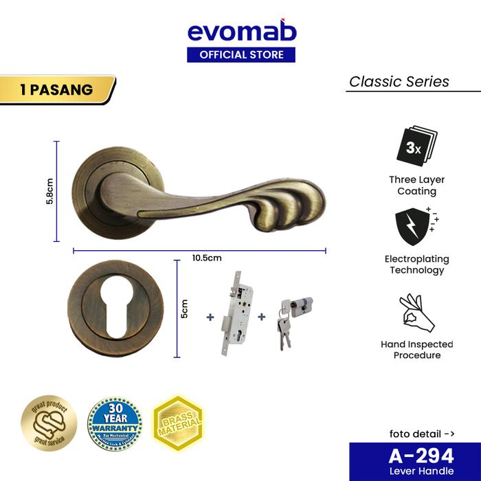 EVOMAB Lever Handle A-294 cocok untuk pintu kayu dengan nuansa klasik/ukir. Dilengkapi dengan finishing Antique Brass, handle ini tahan terhadap karat dan korosi. Berat per pasang 574 gr dengan panjang pegangan 10,5 cm dan lebar ring kunci 5 cm. Tiga layer coating dan electroplating technology membuatnya awet dan tahan gores. Untuk perawatan, cukup lap dengan […]